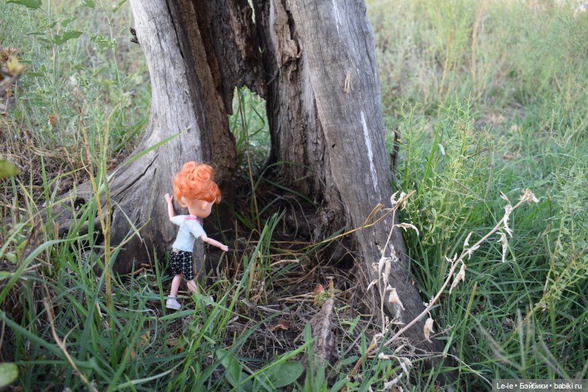 Если посмотреть «с кукольной точки зрения», понимаю, что в нашем дворе очень много интересных мест. Например, такой «пенёк с дуплом» для куклонаселения может быть входом в подвал или колодцем.