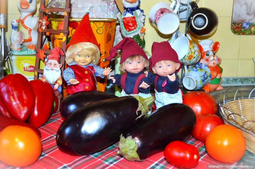 Мне сразу вспомнилось, как мои гномики на кухне хозяйничали, я так и не выложила топик, закружилась… Но с удовольствием поддержим тему сбора урожая, а в частности — баклажановую историю!