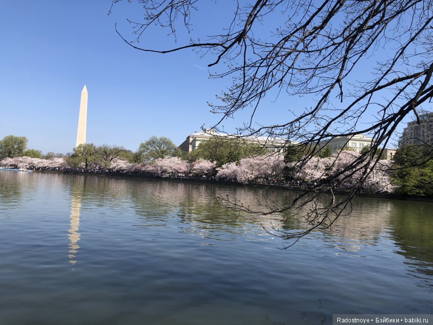 Потом мы пошли по Национальной Аллее к Мемориалу Линкольна. Именно там вокруг водоема (Tidal Basin) расцвела сакура, много сакуры. Пока шли Эмили и Шарлотт пофотографировались на фоне достопримечательностей.