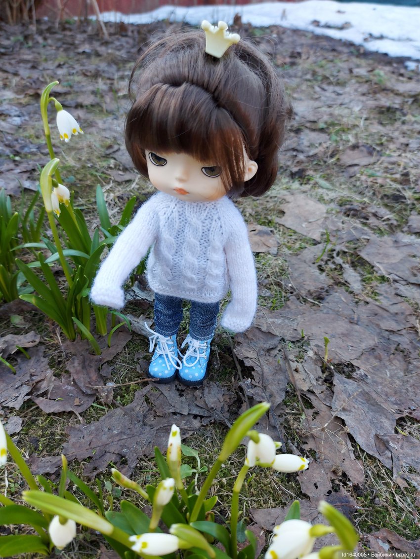 Вот и зелёное наше, яркое!). И пусть ни цветочка, но о серости и унылости теперь не скажешь). А как Мила хороша! И изумрудные чулочки). А ещё махонькая рыжая подружка в сумочке Милы. То спрячется, то выглянет и смотрит по сторонам. И боязно такого большого мира, и любопытно).