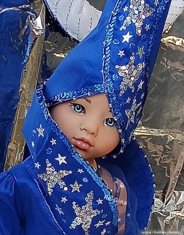 Посмотрите на Богиню Луны! Она, словно звездочет, окутана синевой и сумраком ночного неба, усыпанного серебристыми звездами. Посмотрите, какая шикарная луна, украшенная пайетками, окружает Барби и является её символом.