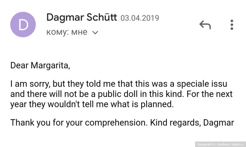 Но это теоретически. Что касается Gotz и МДБФ, я не видела своими глазами нигде ответа от них, что молд Жизель продан, и никогда представители Gotz не писали публично, что не могут выпустить кукол с этим молдом по причине того, что он им не принадлежит. Если у кого-то есть скрин официального ответа от Gotz я, конечно, охотно бы ознакомилась, а пока ответа нет, это всё слухи и домыслы. Так что я склонна согласиться с вашей версией по аналогии с платками. Вероятнее всего у Gotz есть с МДБФ какая-то договоренность о лимите и сроках, и именно поэтому они темнят и ничего точно не отвечают.
