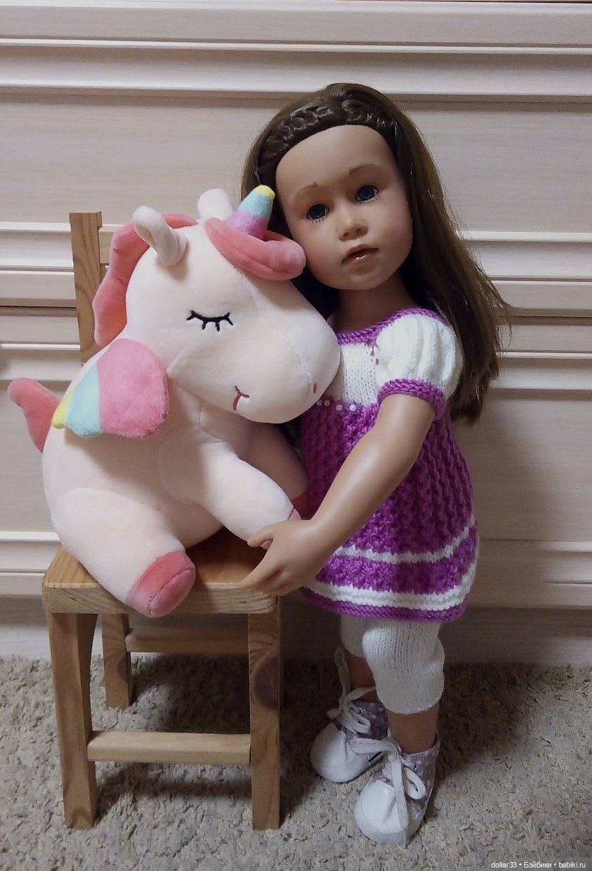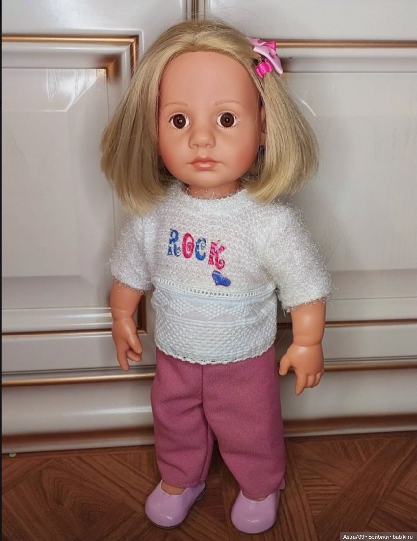 Рост куклы 48 см. У неё полностью виниловое тело. Она прекрасно стоит сама и отлично двигается благодаря 5 шарнирам. Глазки у куклы вставные с накладными ресницами, но они не закрываются. Волосы у куклы так же надёжно вшитые из канекалона. Сейчас выпускают кукол с шарнирными телами, рост 50см.