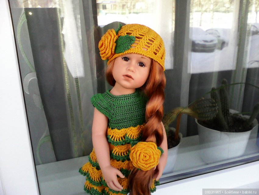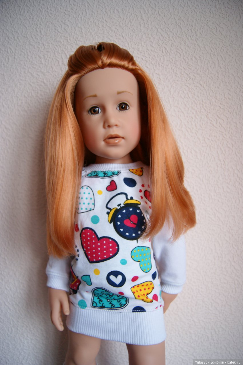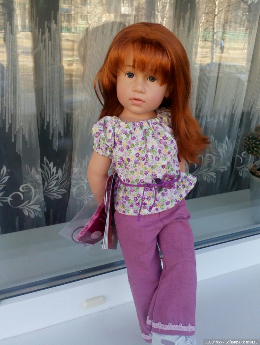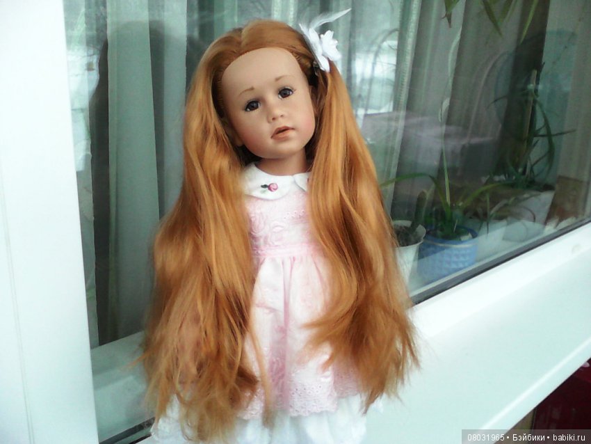 Глазки серо-голубые, удивительно живые, густые волосы богатого, роскошного медно-рыжего оттенка. Такой цвет волос я не встретила больше ни у одной куклы Готц — даже сестра Кианы по году рождения Катарина имеет другой оттенок рыжего.