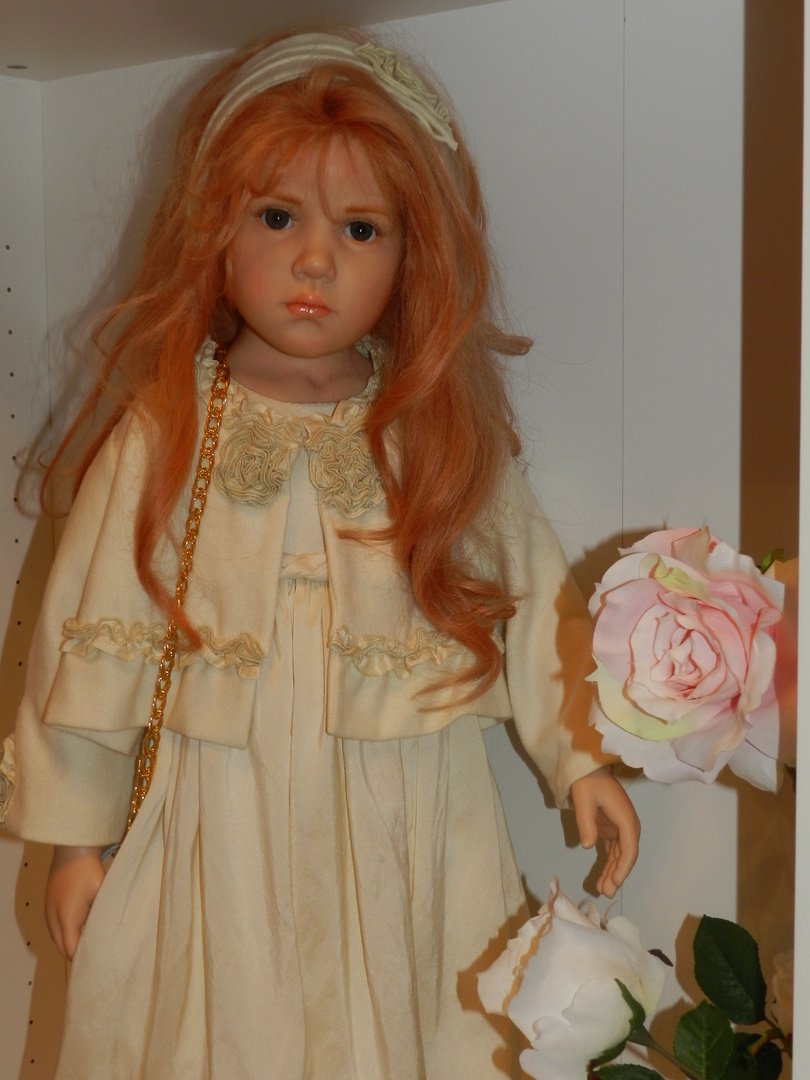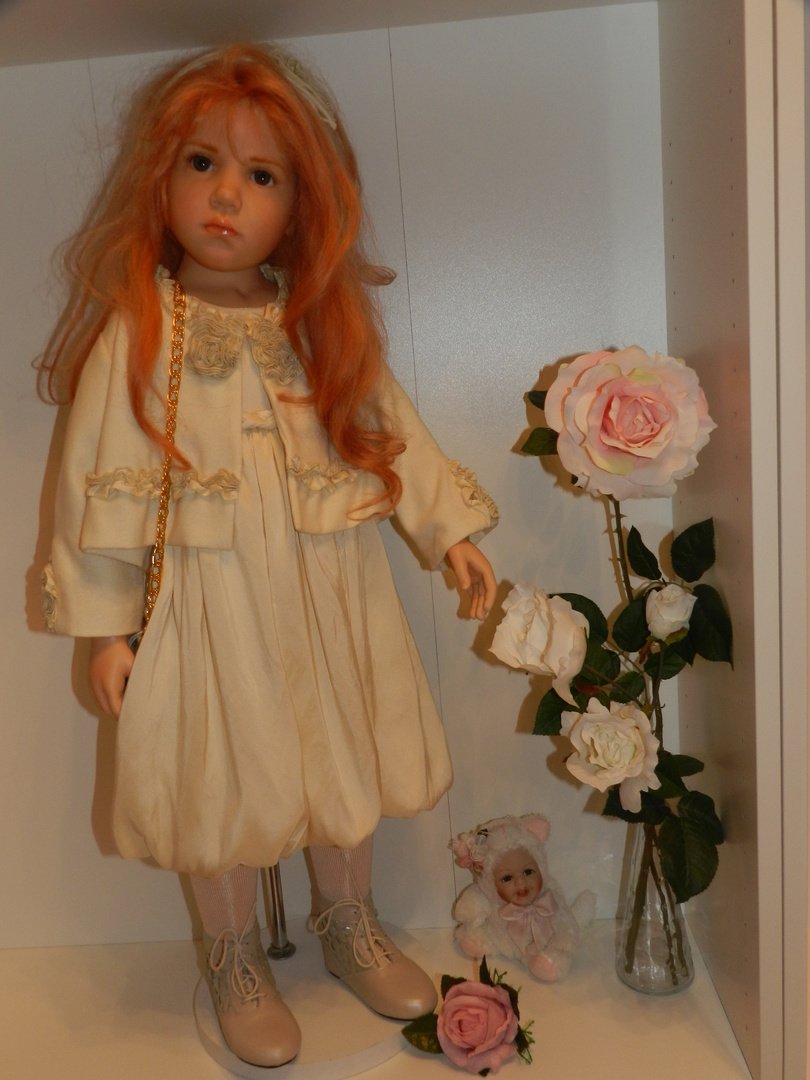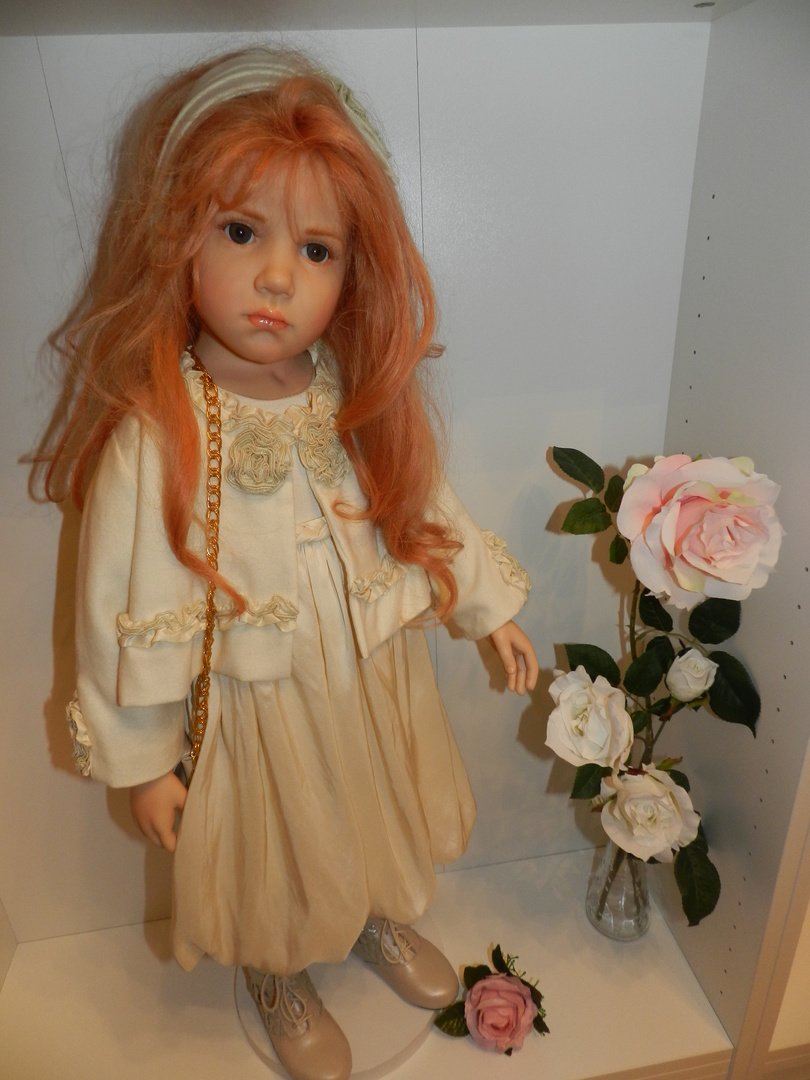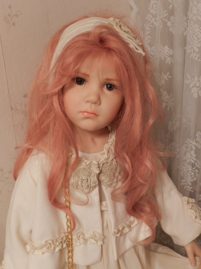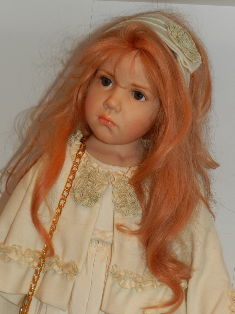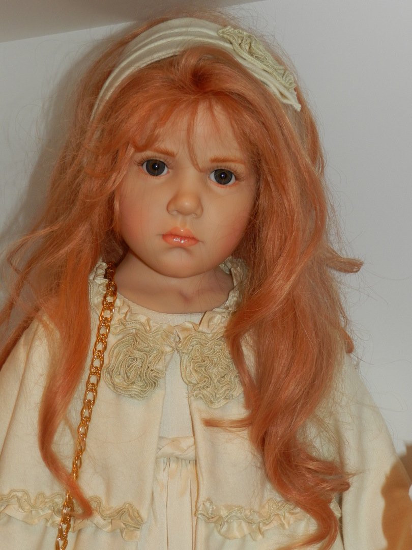 Итак, Люсиль — студийная девочка из резин, коллекция 2010 года под девизом «Как Мило», лимит девочки-150, рост 85 см, густые, натуральные волосы рыже-клубничного цвета, глазки-стекло, шикарнейший аутфит из натуральных тканей, что мы даже ещё не пытались переодеваться, до чего красив наряд и вообще, Люсилечка, ну очень сладкая девочка! Клубничка!