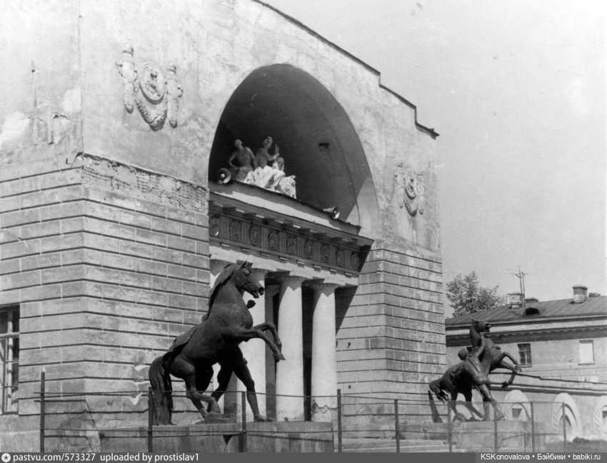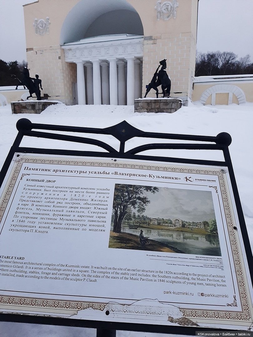 С двух сторон павильона стоят Укротители коней, работы известного мастера П.К. Клодта. Точно такие же как в Санкт-Петербурге на Аничковом мосту.