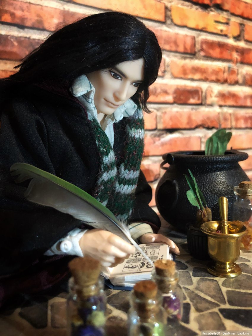 У смены прически оказалось одно неожиданное, но желанное следствие. Я по жизни не очень люблю карие глаза у людей, но не так давно с удивлением заметила, что мне нравятся куклы с очень темными глазами. Мне нравится, как настойчиво и напряженно они на меня смотрят. Они зовут меня к взаимодействию. Такие глаза у Нарциссы, у Киры БМР, у Доры, у Эли. А вот у кукольного воплощения Снейпа, у которого по определению должен быть буравящий, тяжелый взгляд, глаза получились слишком нейтральные. И это для меня было едва ли не более существенным недостатком в остальном отличной куклы, чем молдированные волосы. Но вот сейчас, когда я его перепроклеила, такое ощущение, что у него и глаза как-то потемнели, и он начал на меня смотреть так, как, по-моему, должен смотреть Северус Снейп. Не думаю, что на фотографиях разница заметна, но для меня она имеет огромное значение — кажется, только сейчас у меня возник настоящий контакт с профессором зельеварения.