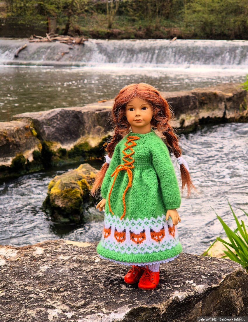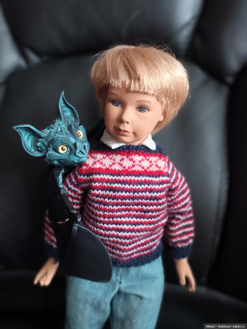 Когда я её оттерла от пыли и налёта, стала примерять одежки. Сначала я хотела одеть её как-то романтично ( фото номер два), но… не получилось. Она браковала все платья которые я предлагала. Пришлось одеть вот так — как мальчишку. И шапка с Али, которая никому не подходила, вдруг пригодилась.