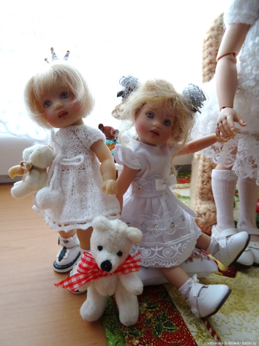 Вязать я не умею, ну ежели только шарф самой простой вязкой, мне это не интересно, а потому- недоступно… терпения не хватает, не моё… Белое платье придумано мной, и связано на заказ мастером с ЯМ!) Что-то шью сама, что-то шьется и вяжется другими… На Татке и Таечке платьица двухлетней давности… Милочке и Полинке вязали на заказ…