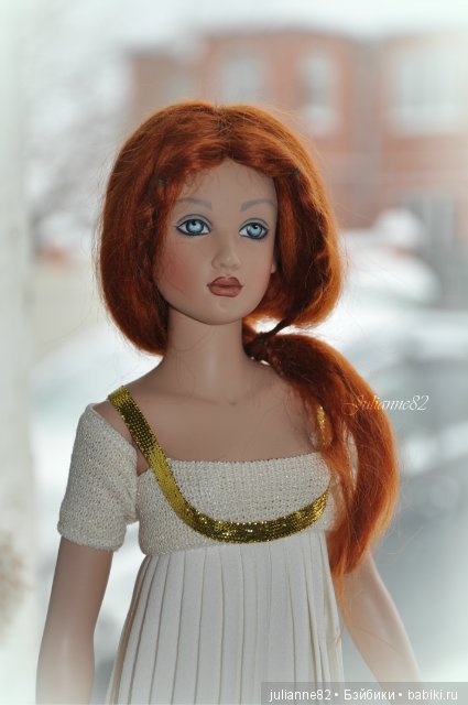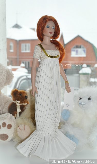 Выпущена в 2003 году, лимит 300 кукол на весь мир. Белое простое классическое платье в пол, красивая диадема, в виде лучей на голове, черная накидка в виде палантина. Все четко, строго и лаконично.Обувь-прозрачные босоножки