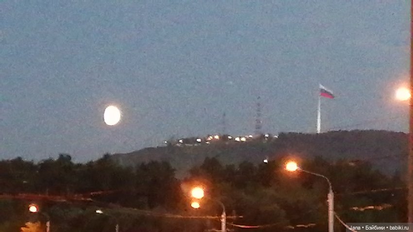 Эх, жаль что спец аппаратуры не было, такую красоту запечатлеть! На этом фото примерно можно масштаб прикинуть. Луна взошла над Николаевской сопкой, одно из наиболее высоких мест в черте городе. А на сопке стоит самый высокий флагшток в стране, высота флагштока — 100 метров. Вот такая огромная Луна)