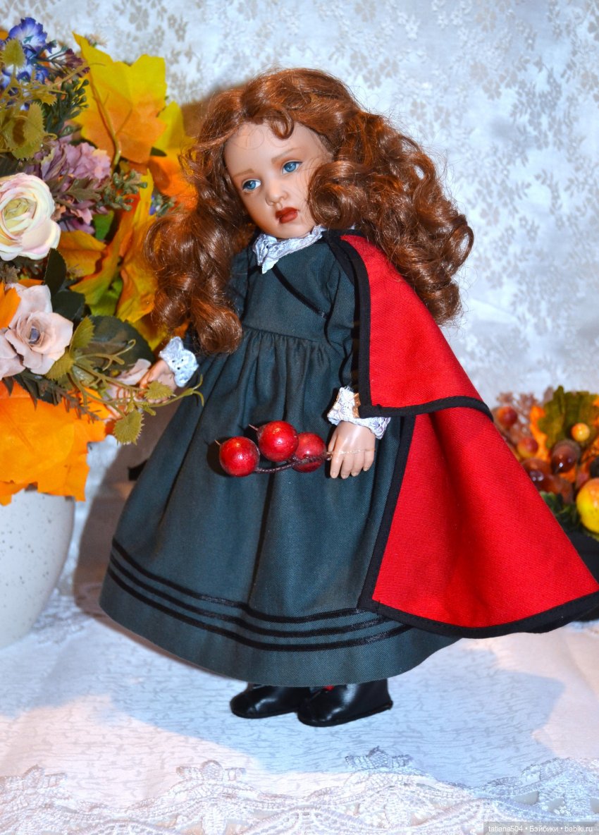 Предыдущая владелица сокровища предупредила, что от лент на шее могут появиться окрасы и перетягивать плащ необходимо под ручками девочки, я так и сделала, но вспомнила, что у такой куклы раньше встречала на платье белые манжеты и воротник, что собственно повторила воизбежания окрасов.(И снова помог образ куколки от Марины).