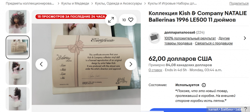 Приехала она ко мне 5 дней назад в большой нарядной коробке не по росту, с документами от другой коллекционной куклы этого автора, с автографом скульптора на сертификате. Но бывшая хозяйка не согласилась с моим предложением вернуть документы другой куклы, в обмен на сертификат Натали, исправив путаницу. (А ведь в объявлении было написано, что кукла приедет с документами и в своей коробке.) Она мне написала, что я «необдуманно поступаю, а теперь задним числом прошу невозможного» и вообще, впервые встречает человека, которого интересуют оригинальные документы на куклу. Но ведь кукла то коллекционная и что мне теперь делать с сертификатом и автографом от другой куклы? Ведь у меня той куколки нет. Эти документы на премиальную куклу «девочка со спичками», 1995 года выпуска, №41… Ведь у кого то она живёт, возможно с документами моей балеринки Натали.
