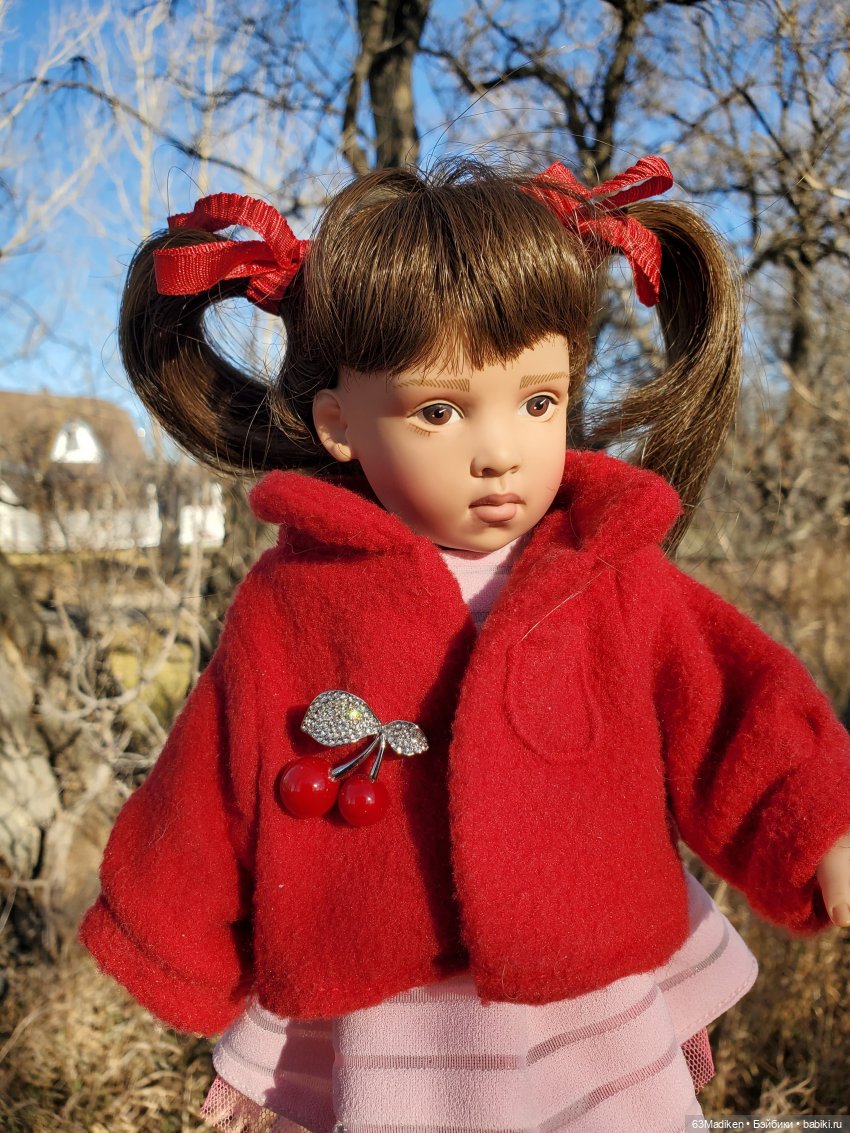Зато курточка красная, яркая! Мы ещё брошечку с вишенками прицепили.