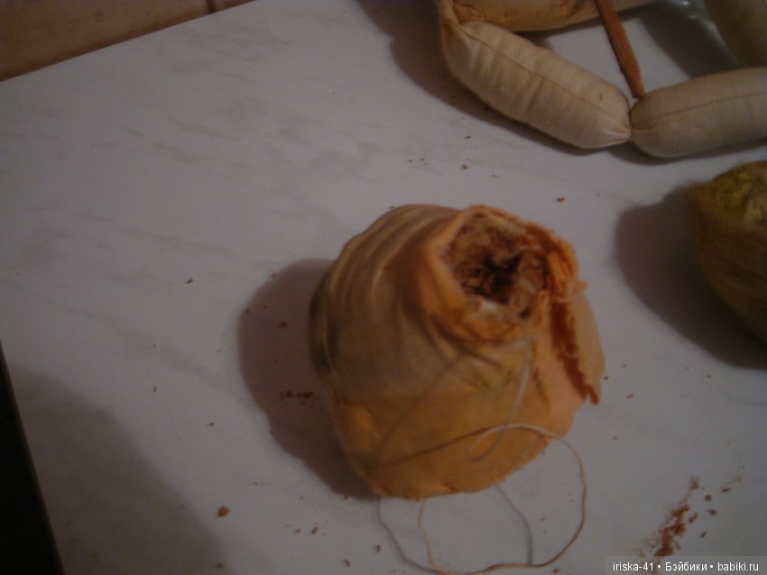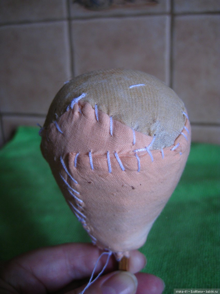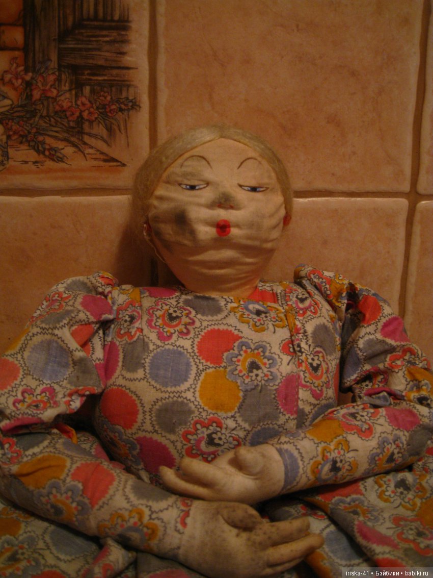 Лицо не просто грязное, оно ещё и деформировано. К телу голова пришита. А для устойчивости, в отверстие шеи снизу воткнута палочка, другой конец которой воткнут в ватную набивку тела.