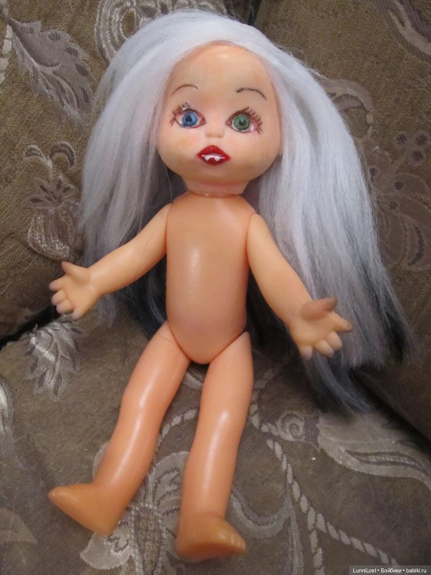Получилось вот это :) Назвал Клодией, теперь надо одевать. Боюсь, меня ругать за это будут страшно, вообще не видел, чтобы с советскими куклами что-то столь эээ радикальное делали. Но желающих с ней делать хоть вообще что-то кроме меня не обнаружилось, так что вот такой вампирчик :)