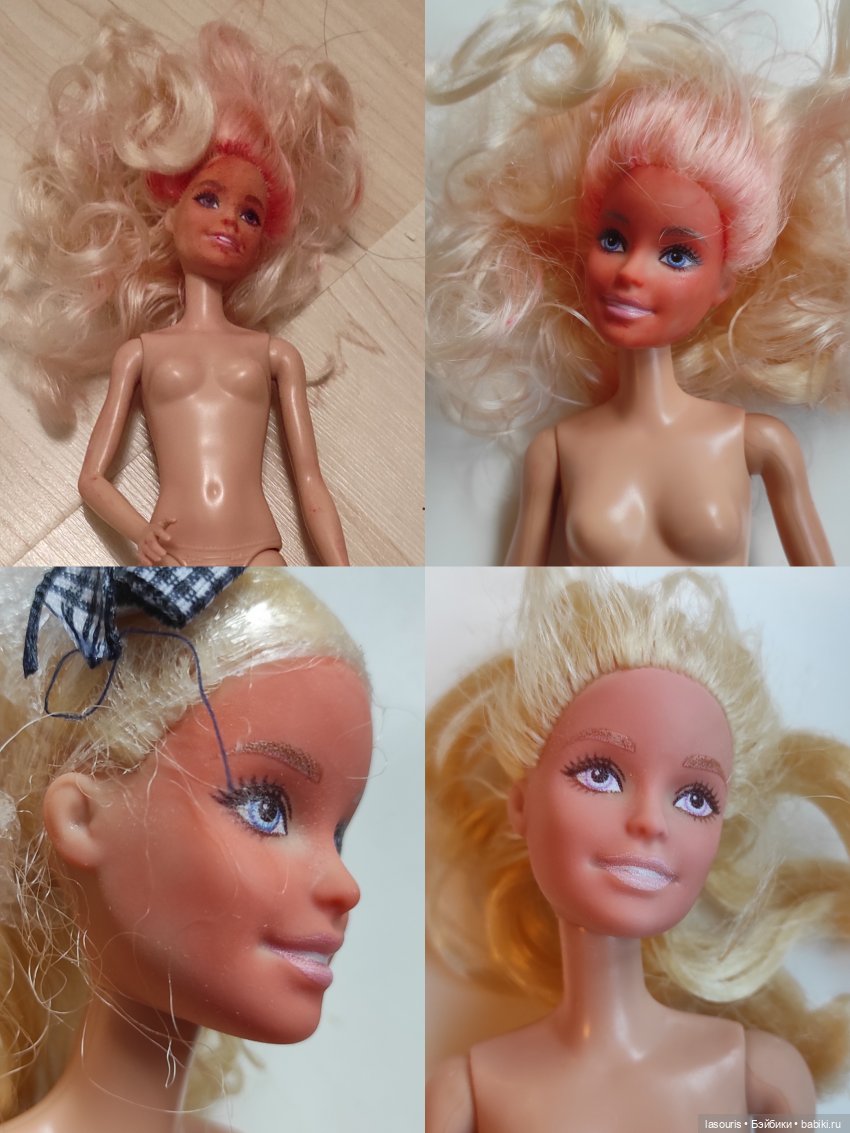 Здравствуйте, от знакомых мне досталась Barbie из серии Fashionista. Чем ее накрасили дети — не знаю, вероятно какая-то косметика. С волос удалось снять маслом, пятна на ногах оттерлись меламиновой губкой, а вот с лица — ни губкой, ни жидкостью для снятия лака, ничем. Сейчас лежит с бензоил пероксидом на лице второй день, но видимых изменений нет. Ждать еще или только белизна с уксусом? Или это вообще нереально вывести? Подскажите, пожалуйста, я новичок пока в этой теме. Сейчас кукла выглядит так.