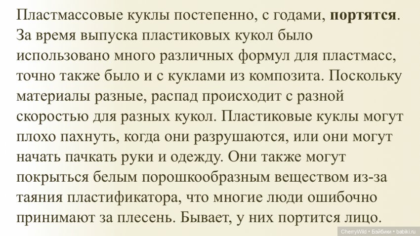 «Спектроскопический анализ и изучение под микроскопом подтвердили, что быстрее всего деградируют части тела с высоким содержанием ПВХ, лица и ноги кукол. Самыми хрупкими оказались самые старые куклы, потому что более изощренные составы в период их производства не применялись. Внешне разрушение чаще всего проявляется в виде глянцевого или белого кристаллического налета, из-за чего к поверхности куклы начинает прилипать пыль. Кроме того, со временем на игрушке начинает выделяться жидкость (экссудат). Происходят такие изменения из-за того, что под воздействием света фталаты — добавки, придающие ПВХ гибкость, — мигрируют из общей массы пластика на поверхность. При этом материал становится хрупким и ненадежным.»