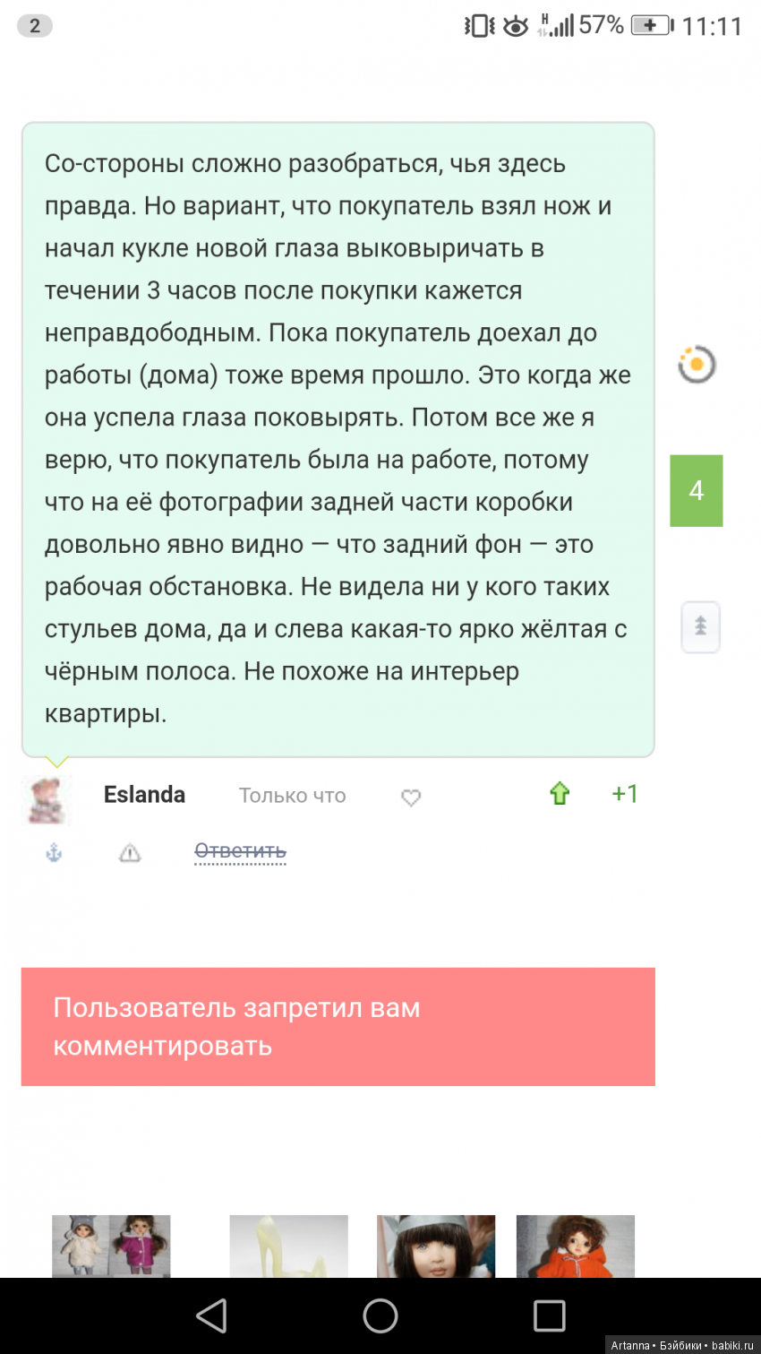 На вопрос о том, почему в переписке только одно фото — молчание. На просьбу вернуть хотя бы часть денег за брак — тоже тишина. Кукла ведь «не её».