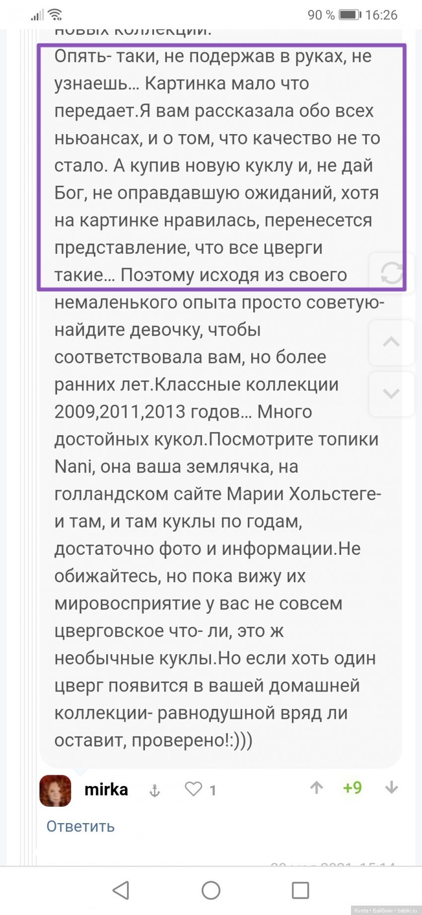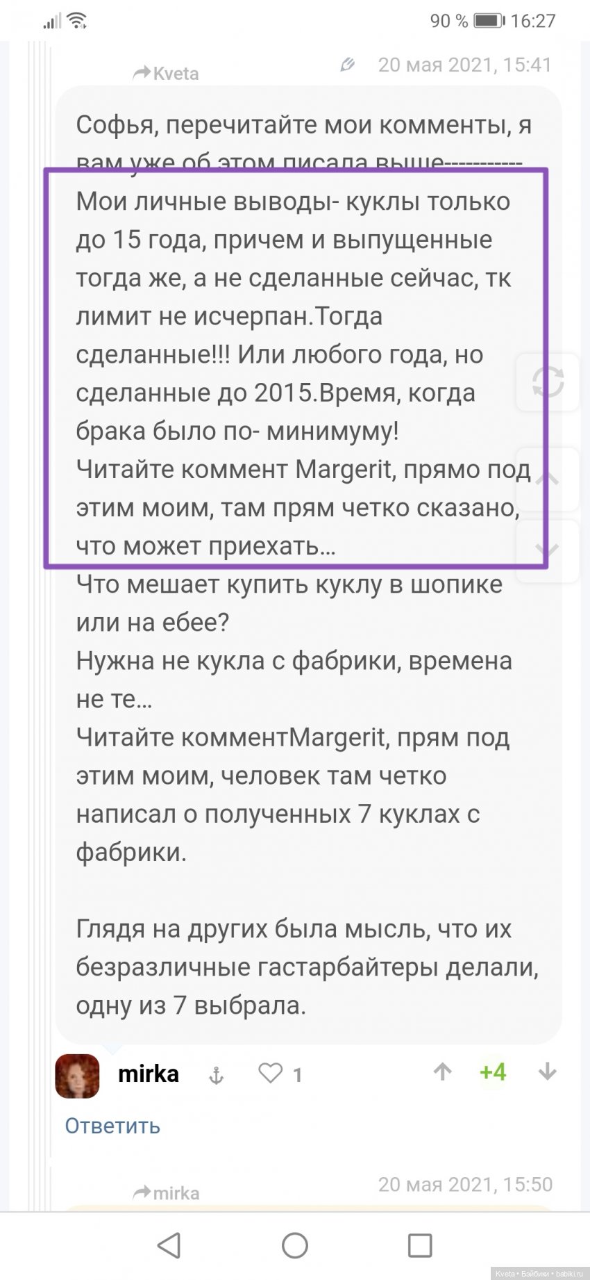 Ну и да, надо было полюбовно решить проблему с продавцом, объяснить честно, что кукла разонравилась по таким-то причинам, а не выискивать «брак» для отказа от покупки. Возможно тогда продавец пошёл бы на встречу.