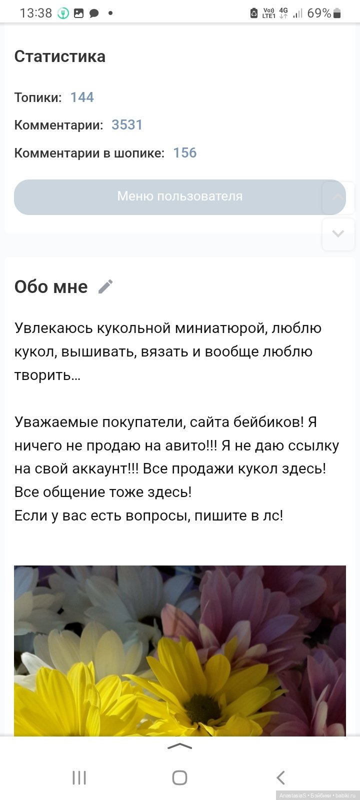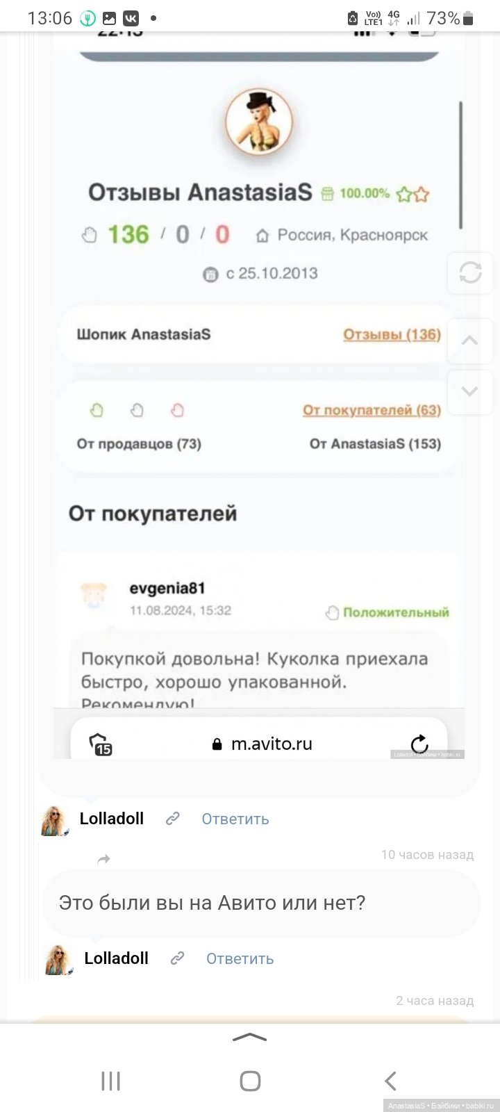 Всем доброго времени суток! Со вчерашнего дня, мне поступают сообщения от людей, что я продаю кукол, на сайте авито и даю ссылку, на свой аккаунт здесь! Уважаемые покупатели, я не продаю кукол на авито!!! Я не даю ссылку, на свои отзывы!!! Это мошенники!!! Все мои продажи кукол только здесь и на данный момент, я ничего не продаю!Я нежно люблю кукол, я уважаю людей, я за каждую свою продажу переживаю, отслеживаю посылку от и до! Я возвращаю людям деньги лишние, за пересыл.Я общаюсь по своим продажам, только тут!