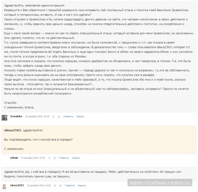 В результате дальнейшего выяснения ситуации ппришло вот такое пояснение от нашего пользователя, позже получившего данную куклу. Исходя из этой информации приняли решение изменить оценку отзыва Покупателя с отрицательной на нейтральную.