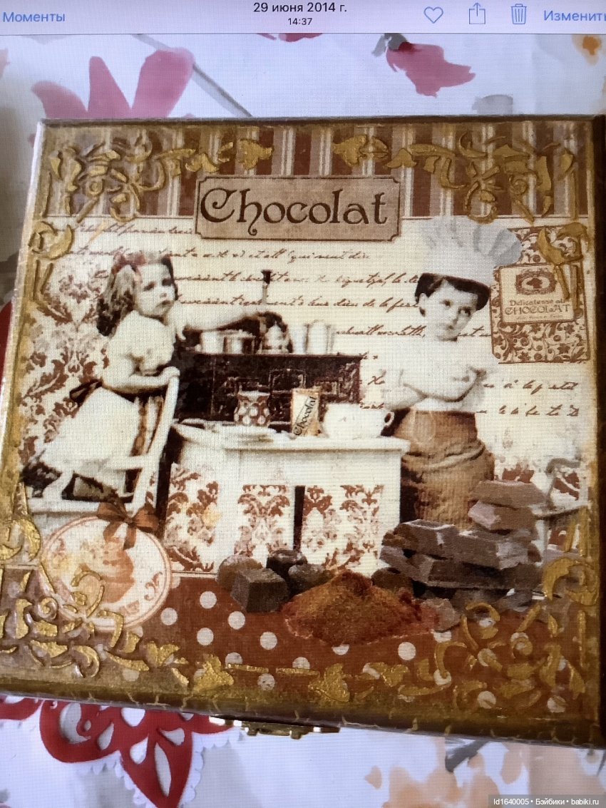 Под стать им принарядилась обычная деревянная коробка. Она стала кокетливой, шоколадно-кофейной. Откроешь ее и детский шоколадный вкус сменится на волнующе горький кофейный вкус взрослой жизни.