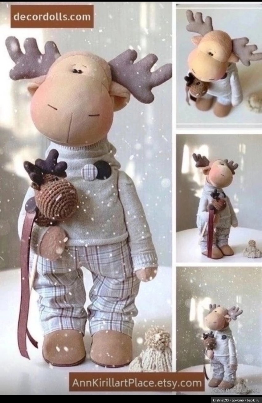 Потом я сшила овечку и лося. Лось долго стоял без костюма, получил его только недавно. За ним последовала текстильная кукла на которую ушло много времени. Я хотела ей сшить костюм снегурочки, но не дошла до этого. Лосю повезло больше.
