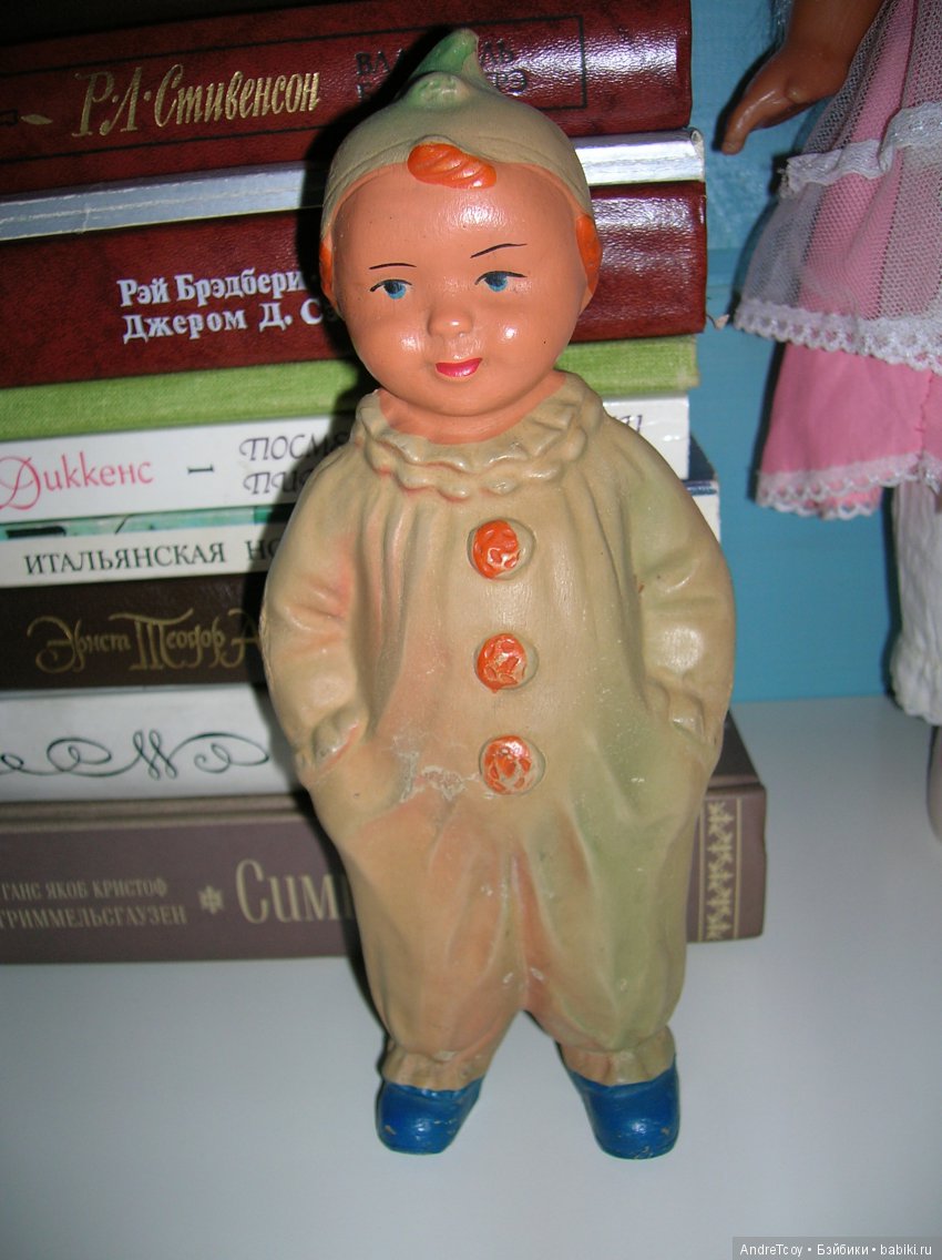 Малыш из резины, опознавательных знаков и клейм я не обнаружила. Ростиком примерно 20 см, с железной пищалкой. Сделала разные фотки и буду рада любой информации.
