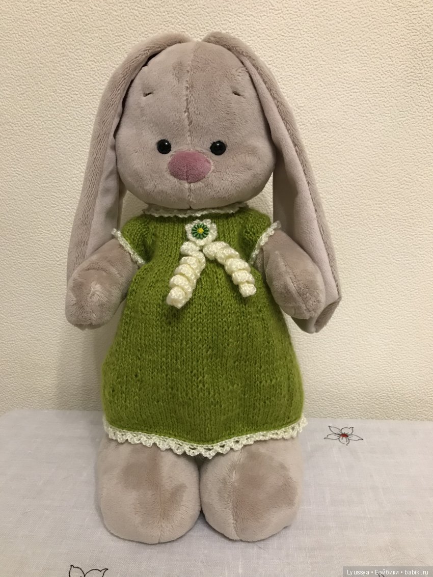 Наша зайка 38 см, дочь так и назвала ее- Зайкой, все конечности у игрушки на шплинтах, так что можно поставить, а можно посадить ее. У нас она тут же обрела довольно обширный гардеробчик, потому что мне часто в секонде попадались одежки кукольного формата, я их покупала для нашего беби-бона, но часть на Боньку была широковата, я думала, что это просто для кукол побольше, ну и убирала в пакет, а оно, скорее всего, это одежда вот для таких мягких игрушек.
