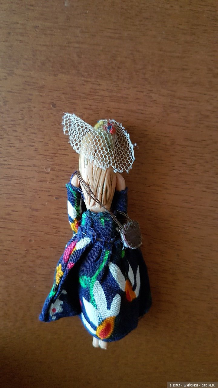 Продолжая тему сокровищ моего детства. Есть у меня еще две таких куколки. Около 8 см. Ручки подвижные. Куплены в начале 90х в галантерее, рядом со школой. Одну я сохранила как есть, она на фото, а вторая, сейчас живет у родителей. Второй я срезала подставку-ракушку. И сняла с нее юбку. На голове у нее шляпка. И ей я шила платья и разную мелкую одежду.