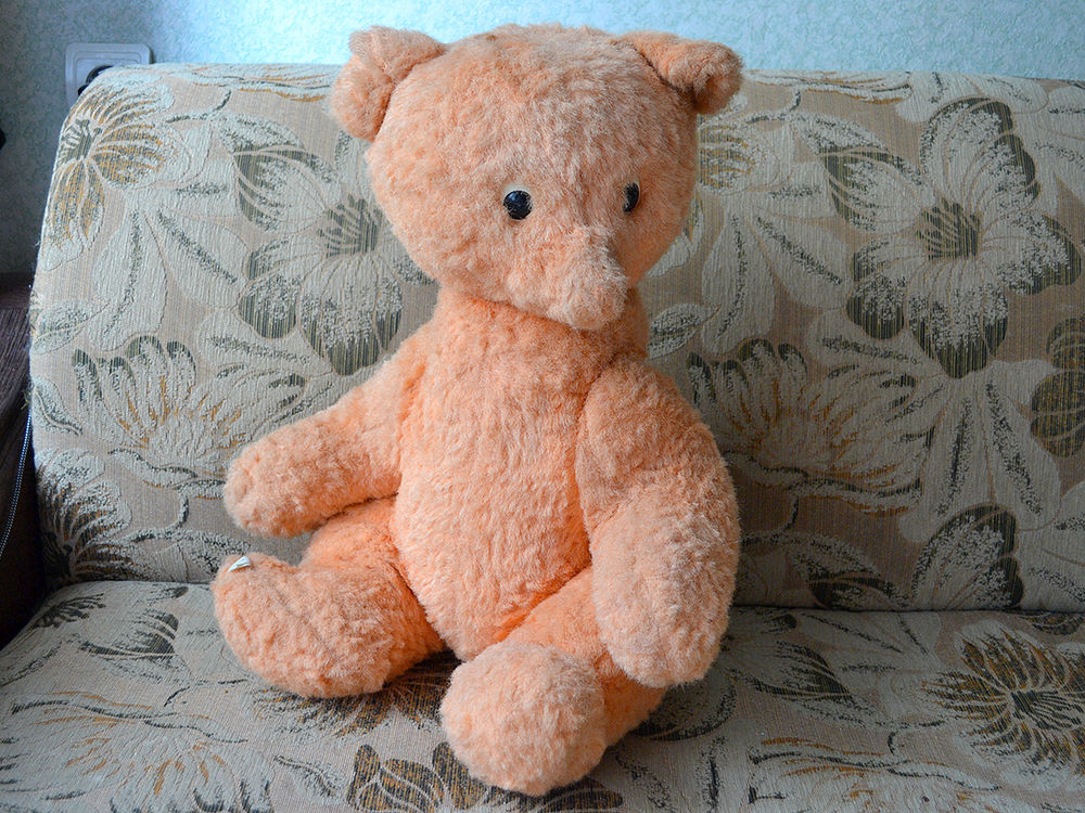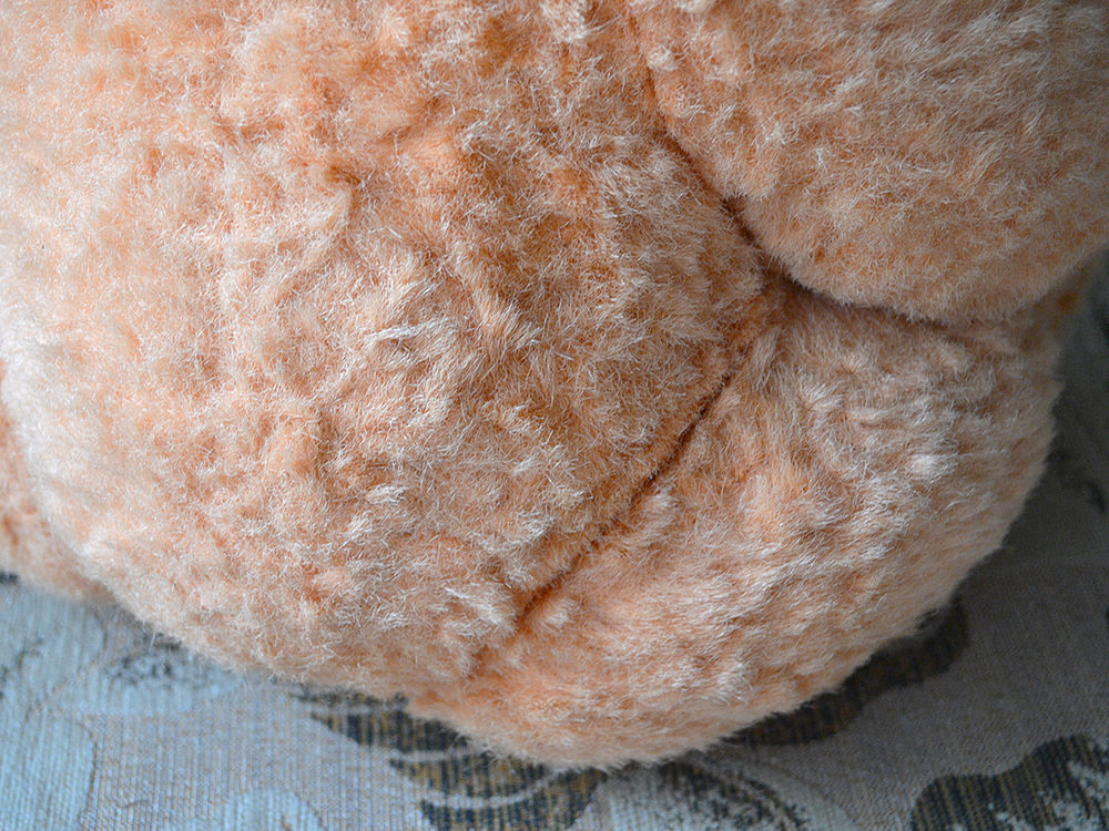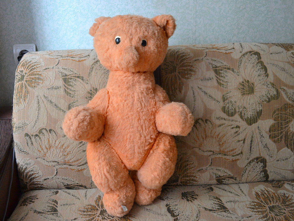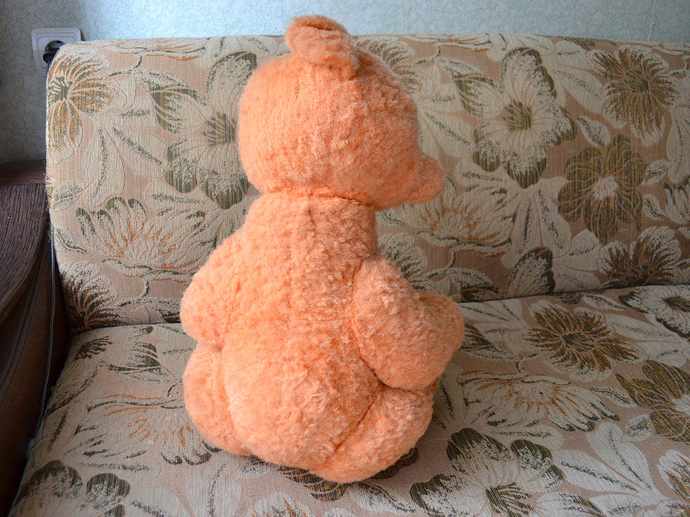 Думаю это мишка, хотя цвет меха приятно светло рыжий, выцвел, стал персиковый. Мордочка узенькая, может это лисенок? Второй день ищу похожую игрушку, может у кого то был такой в детстве, помогите узнать историю. Думаю это советская игрушка. Голова и лапки на шплинтах, швов не видно вообще. Ниже покажу фото. Состояние на 4+, на первый взгляд нет потертостей и проплешин.