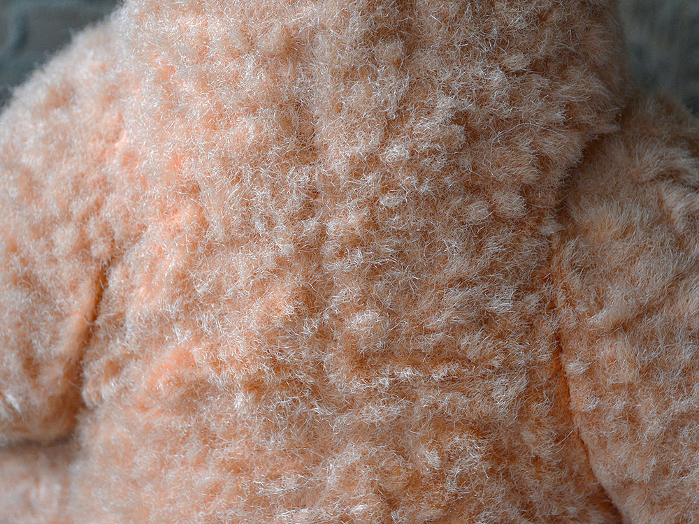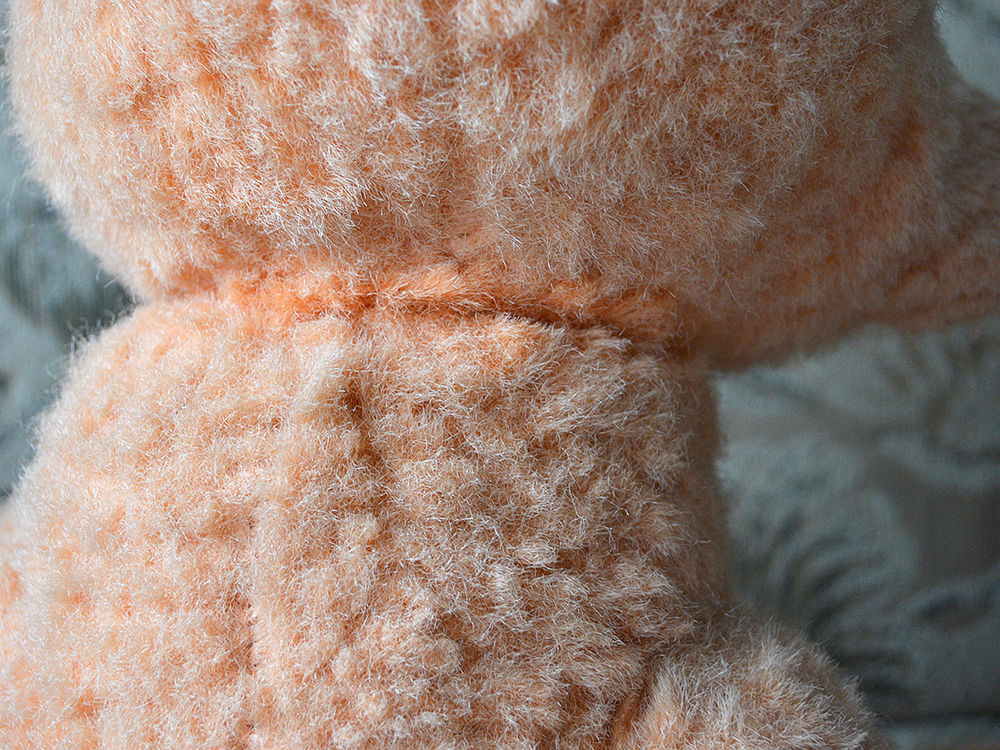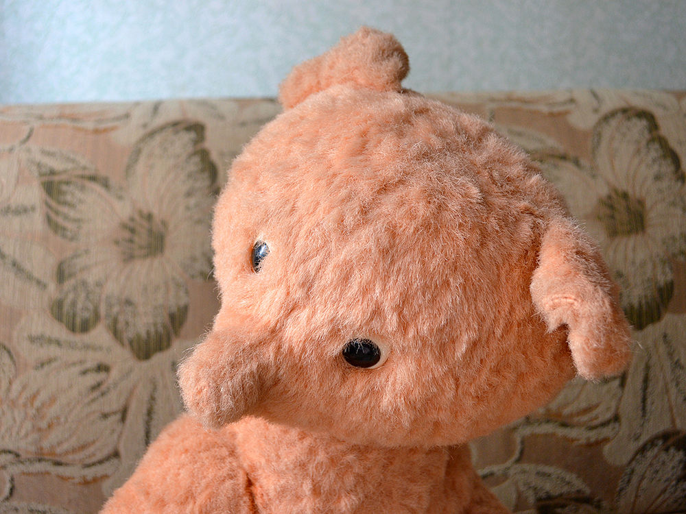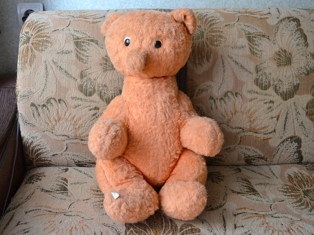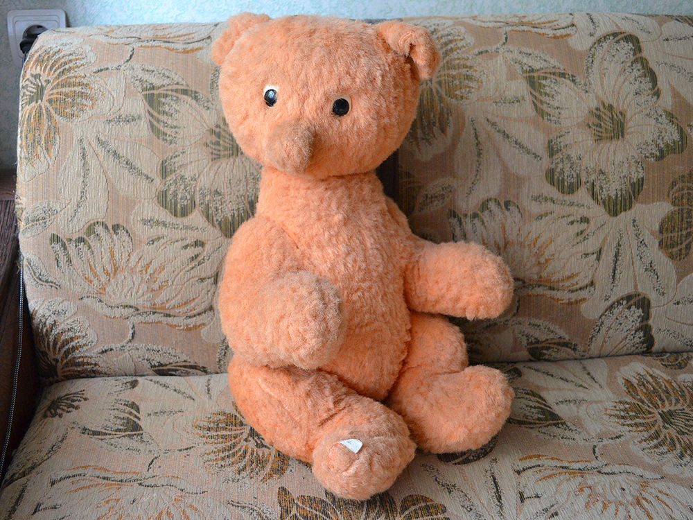 Думаю это мишка, хотя цвет меха приятно светло рыжий, выцвел, стал персиковый. Мордочка узенькая, может это лисенок? Второй день ищу похожую игрушку, может у кого то был такой в детстве, помогите узнать историю. Думаю это советская игрушка. Голова и лапки на шплинтах, швов не видно вообще. Ниже покажу фото. Состояние на 4+, на первый взгляд нет потертостей и проплешин.
