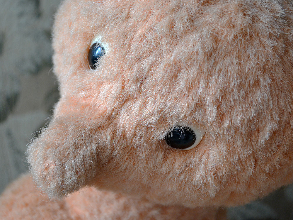 Мордочка узенькая, глаза с белком, пластмассовые, со зрачком. Неизвестно какой был носик, эту тайну тоже надо раскрыть