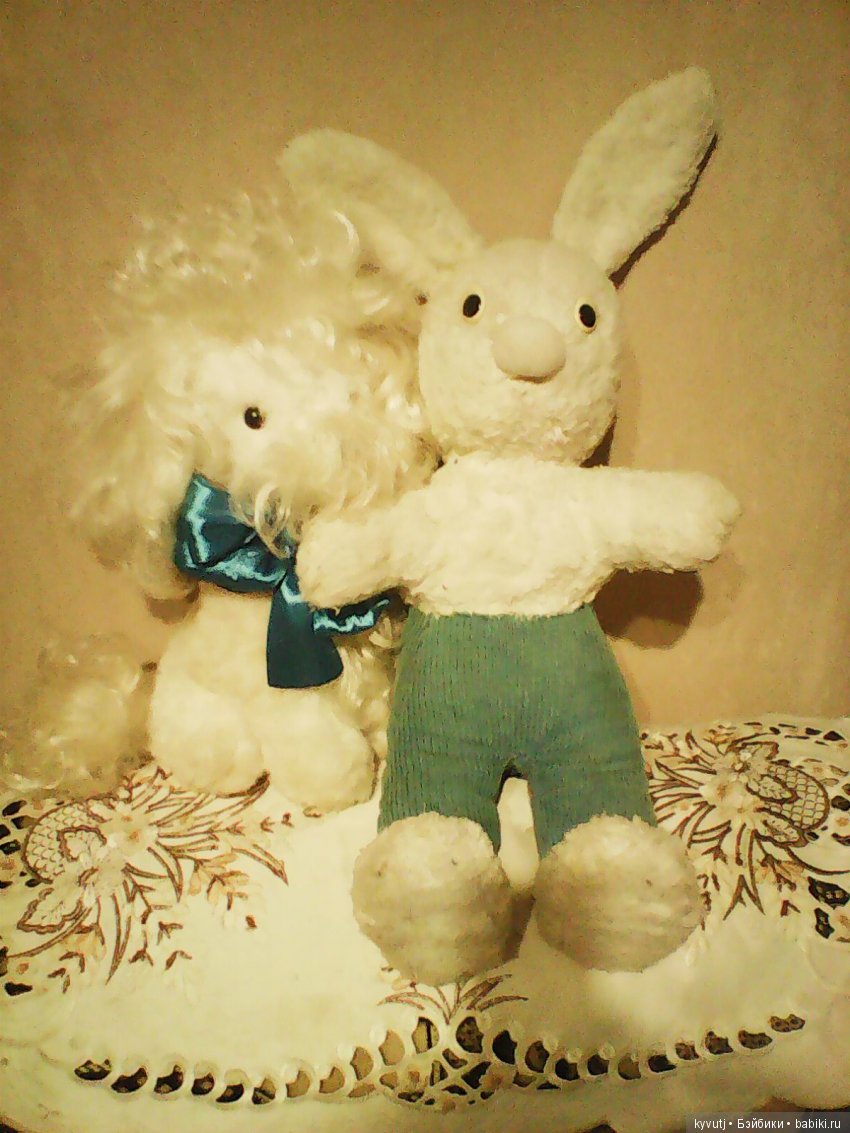 Но фаворитом и главный моим товарищем был он! Зайчик Русачок. Интересно, что где-то в четыре года я поехала в деревню к бабушке и почему-то он там остался. Я про него забыла, конечно, и через лет шесть, приехав туда, ко мне вернулись все воспоминания о нем! Я не могла уехать без своего потерянного друга и с тех пор мы не расстаёмся. Он как мой талисман) Даже на море был) В том году, наконец, поменяла ему паролоновый наполнитель, такая это гадость оказалась.