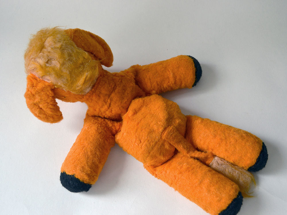 Почтенный возраст ослика, а я предполагаю, что ему 30-40 лет, выдает только поролоновая набивка, которая истлела и превратилась в липкую субстанцию. Игрушка видно, что не игранная. Очень хорошо сохраненная.
