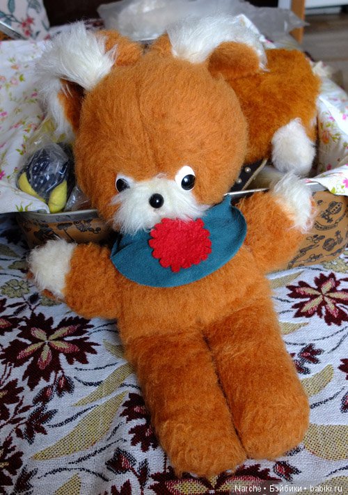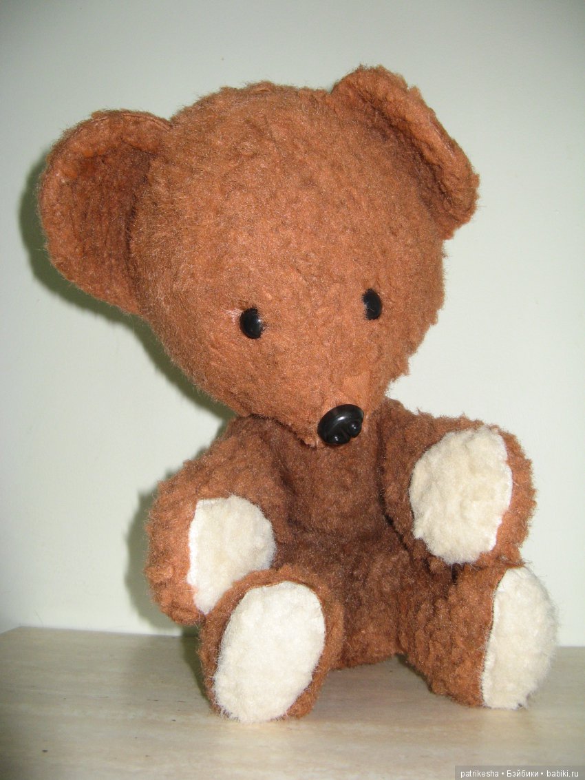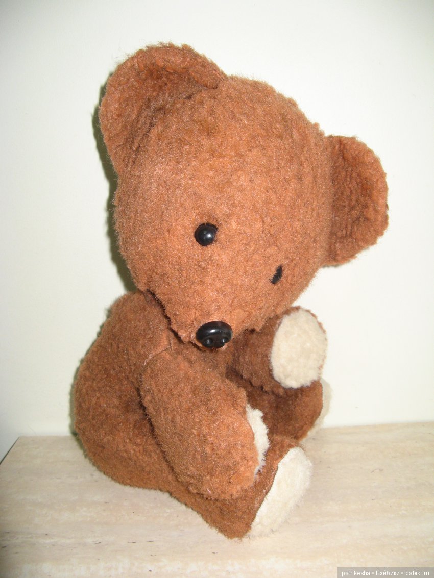 Так вот, среди игрушек брата был мишка моего папы. Как мишка оказался у брата я не знаю. Но я всегда знала, что это мишка моего папы, и считала, что это немного несправедливо: мишка моего папы, значит должен быть моим))) А мишка был такой хорошенький и немного грустный, худенький из-за свалявшейся набивки. Я никогда не выпрашивала у братика отдать мне мишу, даже в голову не приходило))) Но всегда хотела, чтобы именно этот папин мишка был моим, хотела лет так 35)))) А вот год назад «звезды сошлись». Оказывается папин мишка все еще жив. Мы нашли его в кладовке на даче. Я посчитала, что теперь то у меня есть полоное моральное право забрать его себе))) Постирались, поменяли набивку, пришили новый нос. Мише около 60 лет. Сбылась моя мечта )))