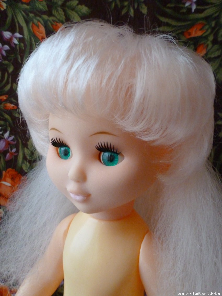 Отмыты от солярки и подкрашены волосы в натуральный цвет. Вставлены голубые чипы из картона в глаза. Подновлен мейк. Перетянута резинки.