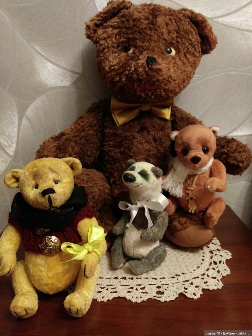 Я не была обделена в детстве красивыми игрушками, мне были доступны прекрасные немецкие куклы и очаровательные мягкие зверюшки-сейчас я понимаю, что мне очень повезло с родителями, задаривающими меня такими волшебными дарами, ведь в нашем советском детстве это было не очень просто. Кого-то из моих тогдашних игрушечных друзей я помню до сих пор, в подробностях и деталях. Жаль, что ничего не сохранилось: все мои богатства были вывезены на дачу, ну а дача впоследствии продана со всем содержимым. Но к моему огромному счастью, мишку (в моем детстве он уже был изрядным стариканом и не был моей личной игрушкой, да и «ценности» для меня не представлял никакой) удалось сохранить: «жил» он не у меня, а у бабушки, и после того, как ее не стало, семь лет назад переехал в мой дом.
