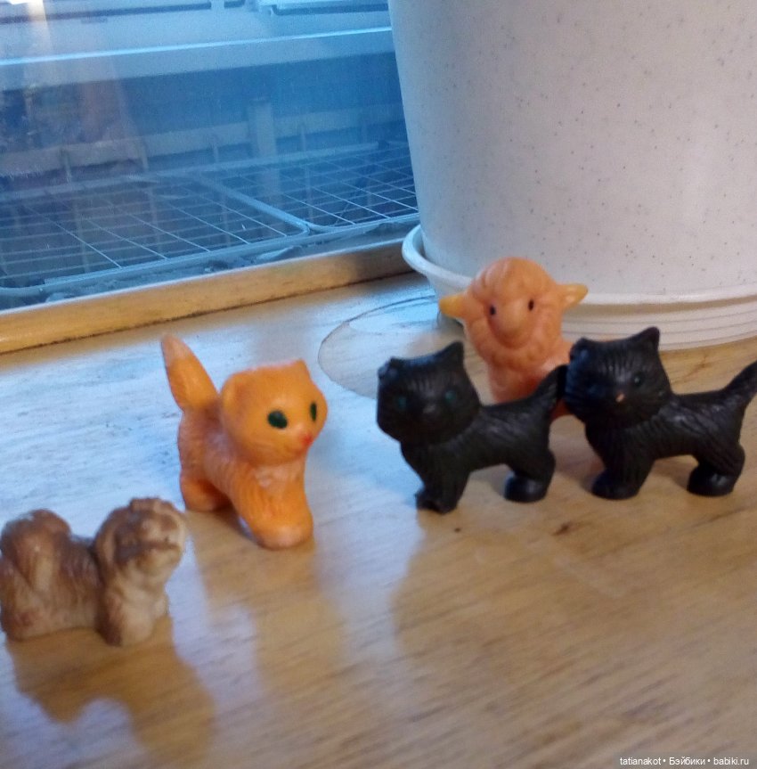 Три кота, баран и маленькая болонка. Черные с барашком были в одном наборе, там еще свинка была, такса… Болонка тоже жила в большой компании резиновых собачек разных пород, но собачки разбежались по школьным мероприятиям в лихие 90-е. Призы не на что было покупать, а жизнь продолжалась…