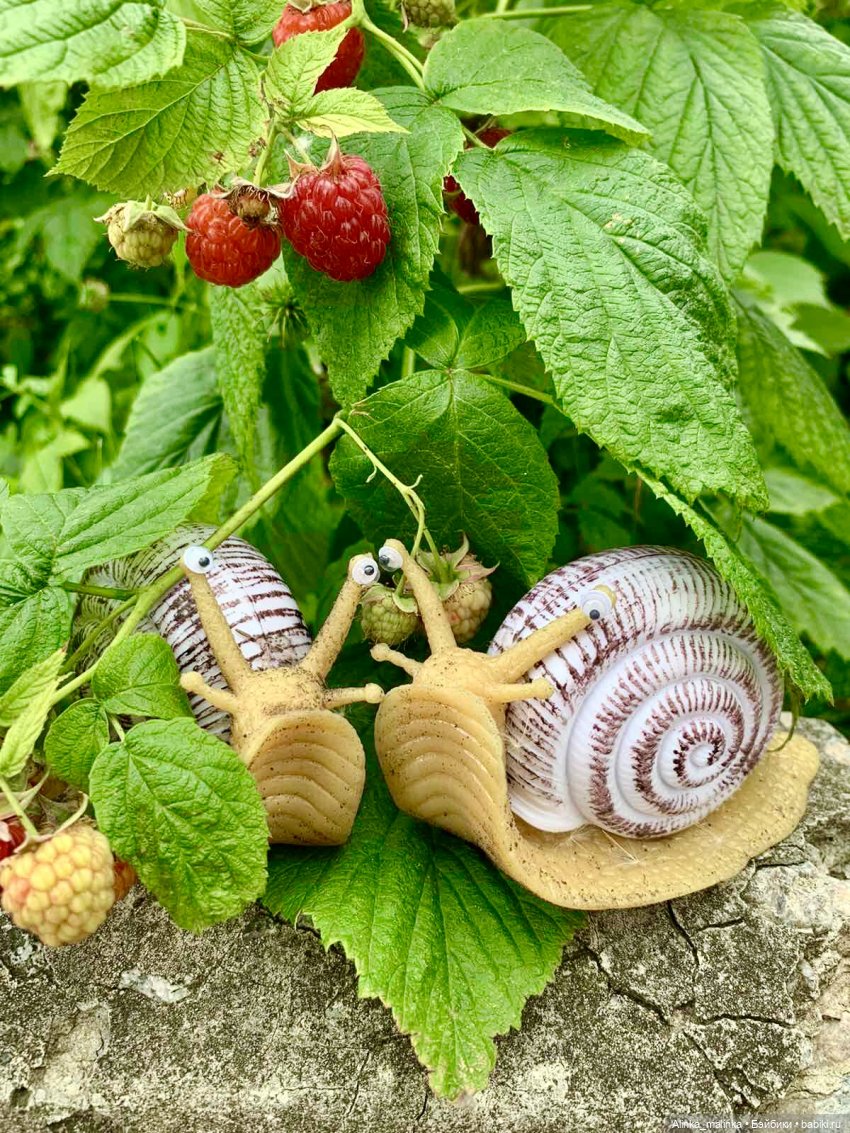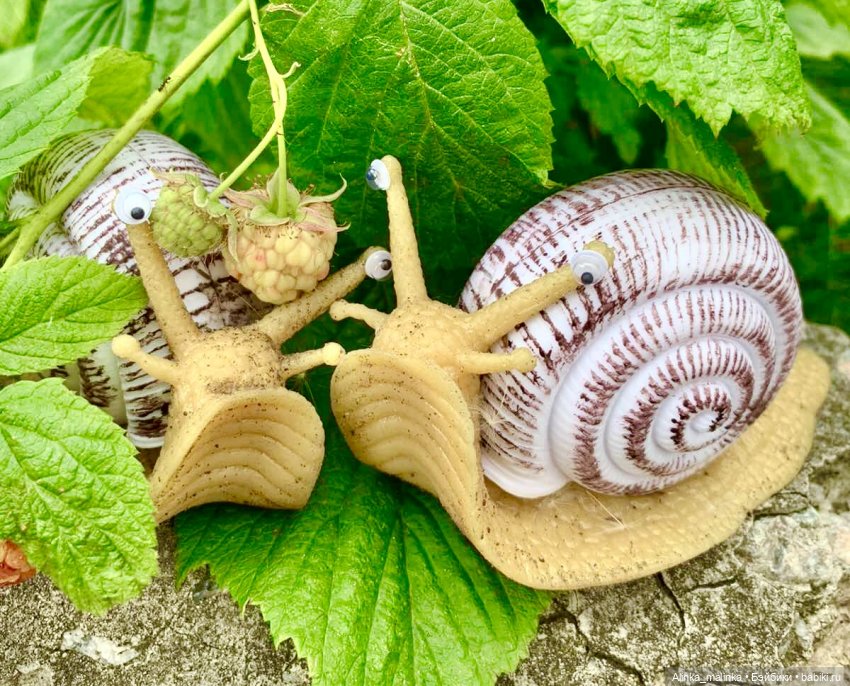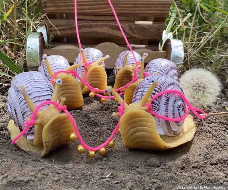 Улитки сначала пыталась сделать сама, но получалось всё не то, в интернете тоже ничего подходящего не нашла. Потом распечатала картинку на принтере и вырезала улиток. Но от них была ненужная тень. Тоже не то! Потом проехала по всем игрушечным магазинам, и нашла!!! Причём они идеально подошли по размеру!!! Они силиконовые, а панцирь пластик! Глазки потом им приклеила !!!