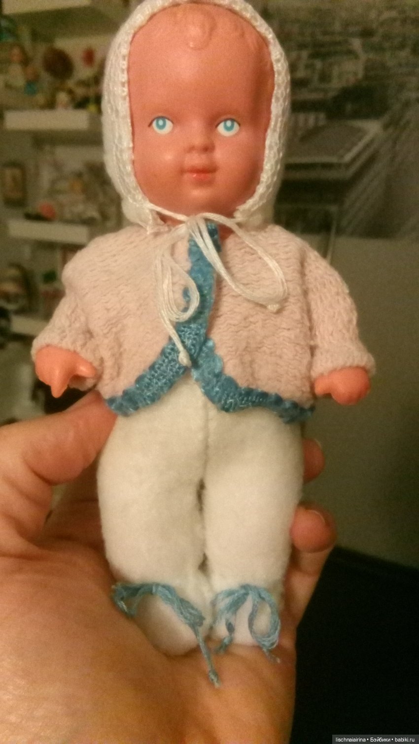 Прошерстила там все и нашла заигранную куклеху-чудика с белым паричком-колтуном на голове, голенькую, но такую родную, сил нет. как будто свою нашла. Это была моя первая покупка куколки из детства! Как я ее ждала! Думала, а если не понравится. не приму вдруг, нет, не может быть… И знаете, отмыв и причесав, поняла, нашла, моя она, счастье накрыло. Ходила к ней, трогала, всматривалась в это смешное личико и вспоминала все, как играла ей у бабушки, как ездила с ней к ней в гости в деревню, Дианка скрашивала мне долгую дорогу, как лепила с ней зимой снежки и катала ее с горки, как мы с ней приходили обе в колтунах от снега и сушили свою одежку на веревке у печки… бабушка вешала мою, а я развешивала так же Дианкину. Сколько было пережито вместе! всегда она была у меня в руке или рядом. В общем незабываемая встреча была у нас с ней. И вот не было, слава кукольным богам, такого, что как пишут многие, не приняла куколку…