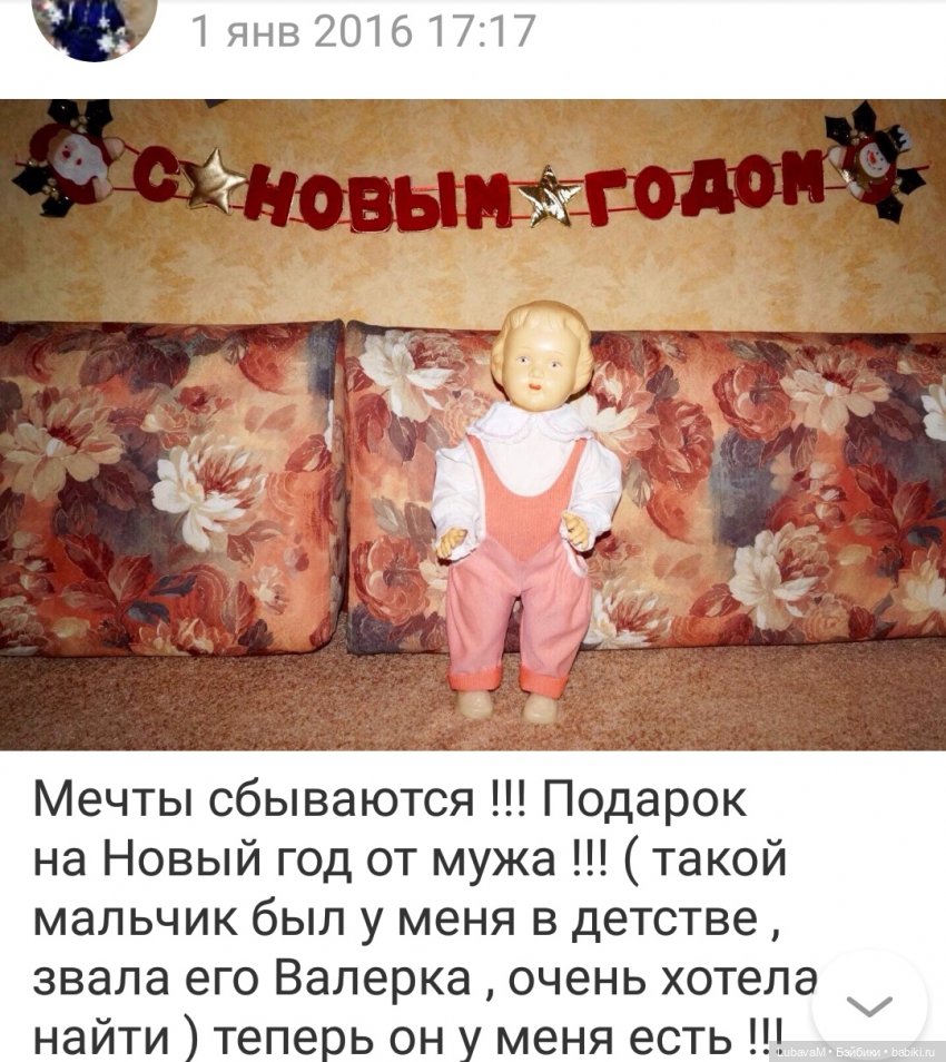 Мечты сбылись. Пупса куклу Валерку (так я звала его в детстве) на новый год в 2016 году мне подарил мой муж Валерий.