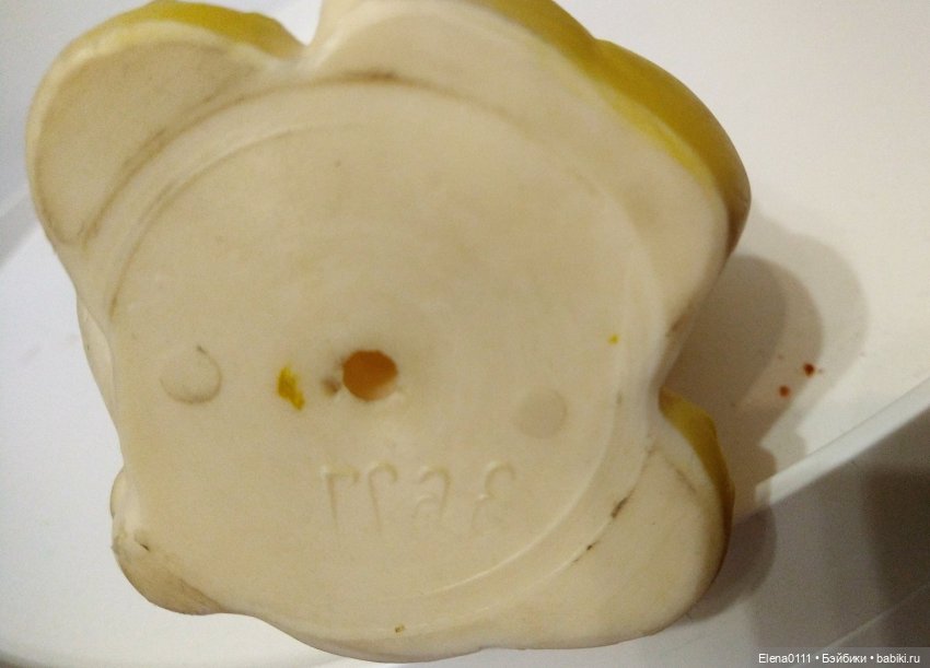 Запаха конечно уже нет, ничем теперь не пахнет, но внешне сохранился отлично. Может потому, что у моих детей он был не самым любимым. Были ещё такой же длинноухий заяц, ярко-рыжая мышь с сыром, плачущий малыш и мальчик в рабочей одежде( по-моему с гаечным ключом). Вот их дети заиграли до дыр, поэтому и выбросили.