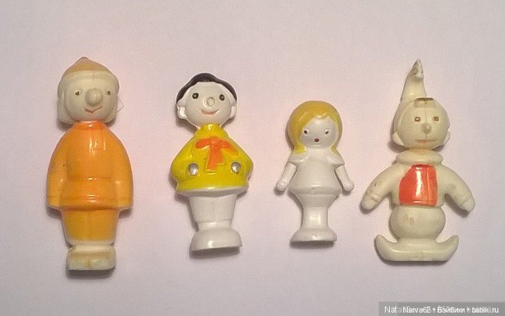 В детстве у меня было 2 набора этих человечков. Сначала появился один. Как и когда — не помню. Кажется, они были всегда. Любимчиком был Чиполлино. Конечно же, он потерялся первым. За ним в небытие ушли Карандаш с колючим носиком, Незнайка в такой приятной на ощупь шершавой фиолетовой шляпе, Дюймовочка нежно-розового цвета… Остался один оранжевый Петрушка. Он нравился мне меньше всех, всегда оставался дома и шанс потеряться у него был минимальный.