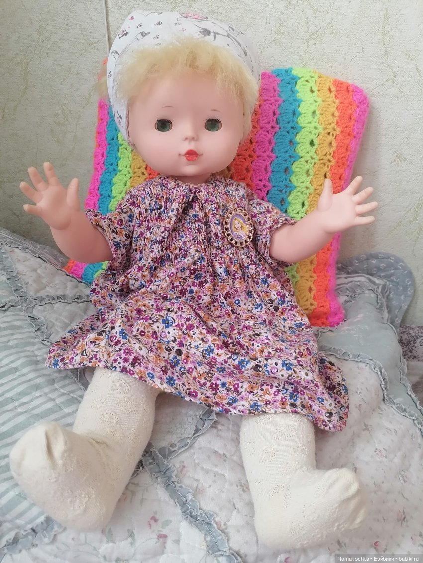Когда увлеклась винтажными куклами, то первой мыслью было найти и вернуть некогда любимую куклу. Осуществить мечту получилось только сейчас, чему я очень-очень рада. Девочка приехала в очень хорошем состоянии, родные краски лица, исправный механизм рук, только без родной одежды и обуви. Поролон внутри тканевого тельца распался от времени и превратился в липкую рассыпчатую коричневую бяку, облепившую механизм и тело изнутри. Механизм отмыла и отчистила, тело вытряхнула и отбелила. Теперь девочка чистенькая и внутри и снаружи.