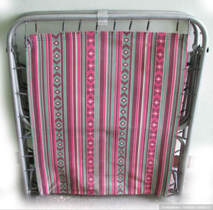 Да, мне хотелось бы ткань поярче, но из плотного был только этот лён в хозяйстве. Я предпочитаю шить из имеющегося, не покупать. А у той раскладушки, на которой загорала я, расцветка была вообще фантастическая: ярко-розовые крупные цветы на интенсивно-зелёном фоне. Со временем ткань износилась и бабушка заменила на серую полосатую.