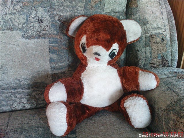 За время моего коллекционирования советских игрушек моя коллекция пополнилась разными медведями, и вот два года назад мой хороший знакомый подарил мне большого мягкого медведя, вернее пока я не распаковала посылку я не знала, что в ней. А раскрыв коробку я увидела Мишку точь — в — точь как из детства, того самого которого я одевала в свои детские вещи, кормила кашей, за что на меня мама ругалась, потому что ей приходилось его потом отмывать.