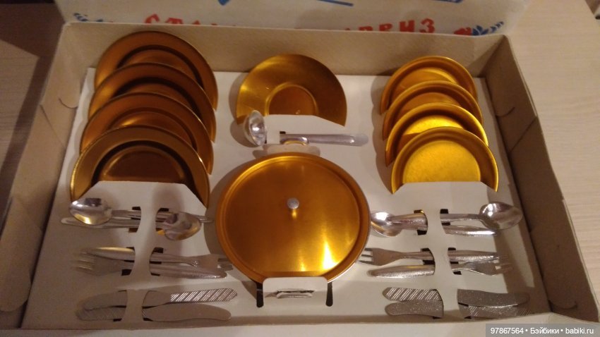 А посудка такая была разрозненная, помню кто то отдавал. Родни много. Приезжали в гости и отдавали игрушки из которых вырастали наши двоюродные и троюродные сестры. И я точно помню такие тарелки и тазики золотые. Вилки-ложки-ножи тоже были.