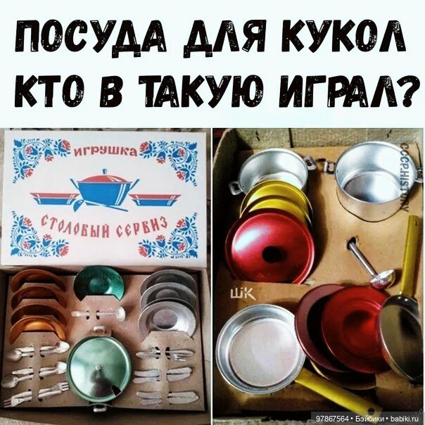 Она была огромная! Раскладывалась как чемоданчик на две части! Там был столовый, чайный наборы на 6 персон и кастрюли, сковородка, дуршлаг. Красота, все, что нужно! После пластмассового наборчика она казалась волшебной.